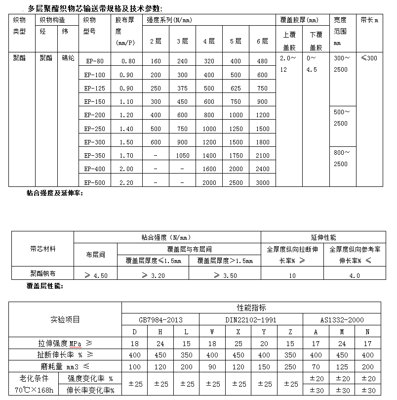 聚酯輸送帶又稱EP輸送帶,其骨架材料為經(jīng)向滌綸、緯向錦綸交織而成的聚酯帆布,其性能特點是經(jīng)向的低延伸率和緯向的優(yōu)良成槽性能,耐水性好,濕態(tài)強度不下降,不發(fā)生霉變,初始模量高,適用于中長距離較高載重、高速條件下輸送物料。